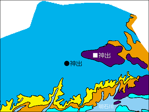 神出町のほとんどの地域は、高位段丘面で古い海岸段丘です。段丘面の下には大阪層群があり、明石川に降りる斜面で顔を出しています(下の方の黄色・だいだい色の部分)。雌岡山のふもとにある神出中学校は丹波層群の上にあります。