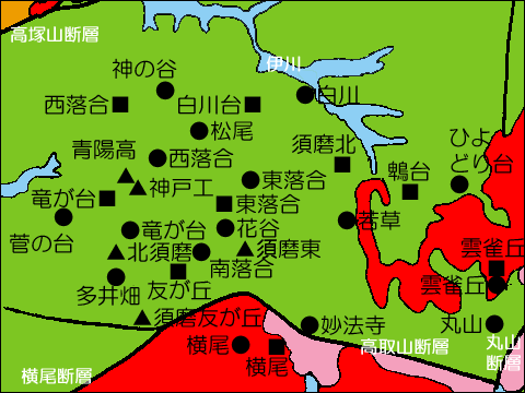 須磨区北部のニュータウン地域は、高塚山断層、丸山断層、高取山断層、横尾断層に囲まれた、神戸層群の広がる丘陵地です。横尾断層−高取山断層の南側に位置する横尾団地は、花こう岩でできています。