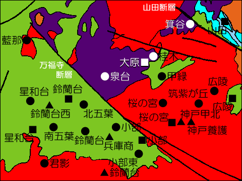 鈴蘭台は白川の方から続いている神戸層群が広がっています。鈴蘭台から箕谷の方に向かっていくと、万福寺断層を越え、花こう岩または丹波層群の地層に変わります。このあたりはいろいろな地層がモザイク状に出ています。