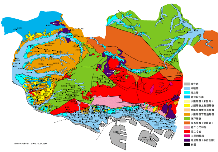 垂水区の東と西の地層は、高塚山断層によって大きく二つに分けられています。西には大阪層群、東には神戸層群です。さらに東の須磨区に入ると、横尾山断層があって、その東側は花こう岩になります。大阪層群−神戸層群−花こう岩と断層ごとに地層が変化していくようすは、六甲山のでき方と大きなかかわりがあります。滝の茶屋、東垂水、霞ヶ丘の海岸にそった地域には、海岸段丘が見られます。