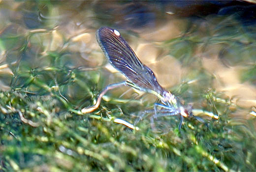 生態:出現時期は5月中旬から8月までですが,7月中旬を過ぎると数は減ってきます.オオカワトンボのあと,そしてハグロトンボの前にすがたをみせはじめます.清流にすむトンボで,各生息地ではかなりの数がまとまって生活しています.よく晴れた日など,たくさんのメスが流れになびいている水生植物に止まって産卵しています.そんなときオスはメスの気をひこうと必死で,まわりを飛びながらようすをうかがい,メスの直前で突然水に落ちるようにして水面に浮き,翅を半分広げたようにして流されます.こういった行動を通して,やっとメスを獲得できるようです.メスは,ときには水中にゆれるモにつかまって潜水産卵をおこないます.