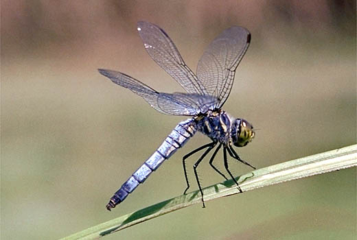 形態:腹長22〜30mm.オスもメスも同じように青灰色の粉をふくトンボで,シオカラトンボなどとは,胸の側面の斑紋のちがいや,全体的な体型のちがいで簡単に識別できます.メスは多型で,俗にオビトンボといわれる,ミヤマアカネのような翅を持つものがありますが,神戸ではまだみつかっていません.