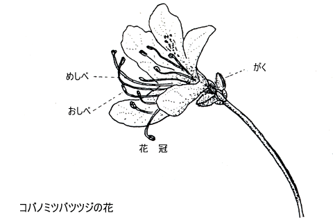 花は枝の先端に1〜3個集まってつき、花の大きさは直径約3センチ、先は5つに分れており、斜め上または横を向いている。花の色は、六甲では淡い紅紫色が多い。