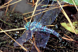 オオルリボシヤンマ:六甲山地にある池に数多く生息しているヤンマ。ルリ色の斑紋が美しい。 |
