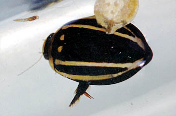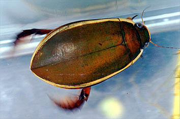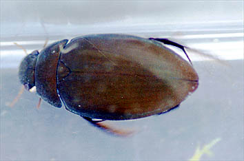 ガムシはゲンゴロウに似ていますが、肉食性のゲンゴロウと違って水草を食べて生活しています。これも大きさは3cmくらいあります。これとよく似た形のヒメガムシは大きさが1.5cmほどです。 |