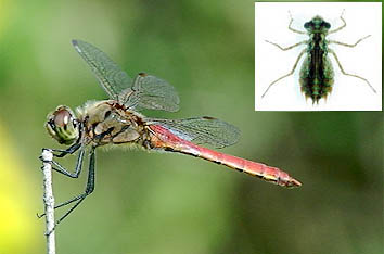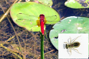 赤いので赤とんぼとまちがえられますが、アカトンボのなかまではありません。夏の暑いさかりに、池のまん中に止まっていたりします。よく目立つトンボです。幼虫は学校ビオトープでもよく見つかり、アオミドロの中にもぐりこんでいたりします。 |