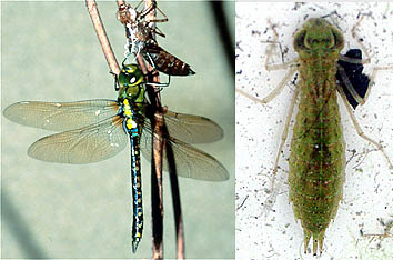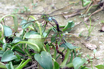 ギンヤンマは春から秋にいたるまで、明るい池の上や水田を元気に飛ぶ、代表的なヤンマです。緑色のからだに茶色の腹部、オスは腰(こし)の部分が水色になります。卵を産むときは写真のようにオスメスがつながります。 |