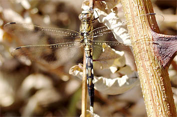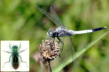 シオカラトンボのオスは青白い粉をふいたようになります。幼虫は活発で。泥の中にもぐっています。春から秋までずっと見ることができます。 |