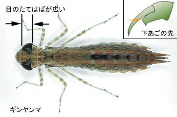 ギンヤンマとは、下あごを裏から見て、カギのような突起の下の部分の角が丸まっていることで判断します(写真の中の絵を見てください)。 |