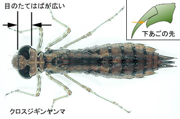 クロスジギンヤンマとは、下あごを裏から見て、カギのような突起の下の部分の角が角張っていることで判断します(写真の中の絵を見てください)。 |