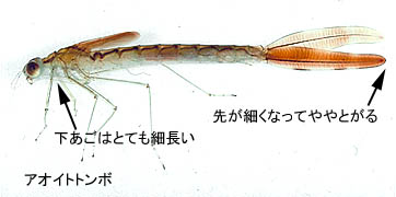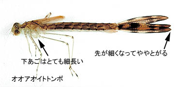 体がしなやかで、よく動きます。あみですくうと魚がはねるように、ピンピンします。下あごがものすごく細長いのが特徴です。下のオオアオイトトンボとはまず区別がつきませんが、終齢のヤゴは5月を中心に現れ、6月後半にはヤゴはいなくなります。
