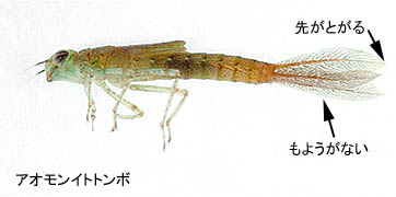アジアイトトンボとアオモンイトトンボはそっくりです。アジアイトトンボのほうが少し「えら」のはばがせまいようですが、夏にとれるヤゴには太いものがあり、判断の基準になりません。