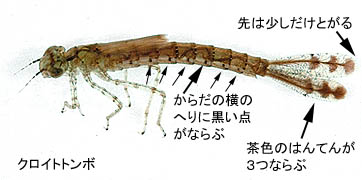 「えら」にはっきりとした3個のはんてんがあり区別できます。また腹部の横のへりに、一節に一つずつ黒い点があります。