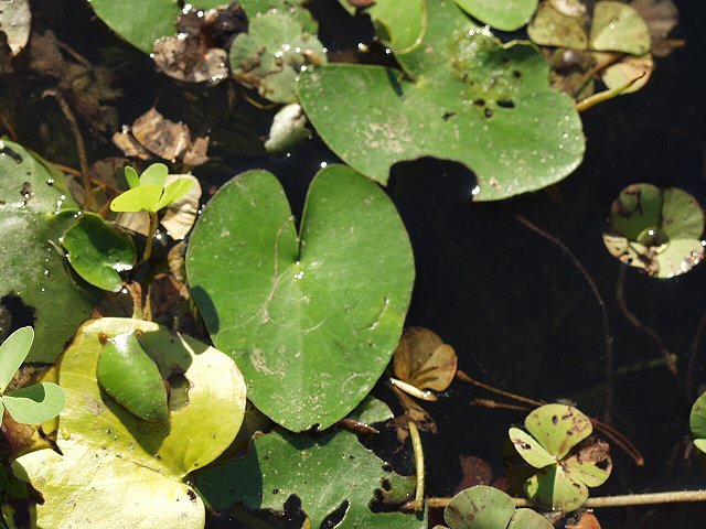 葉を水面から出していますが、葉のうらがわは、赤むらさき色をしています。
