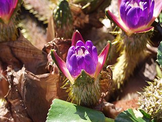 大きな葉の間から、4〜5cmのむらさき色の花をさかせます。