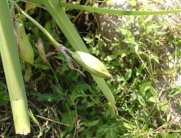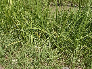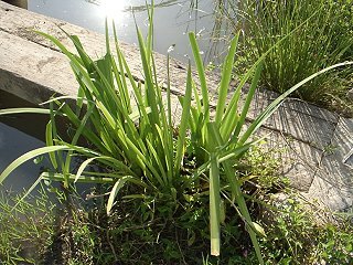 ・池のまわりにたくさんはえている植物で、細長くて少し分厚い葉です。