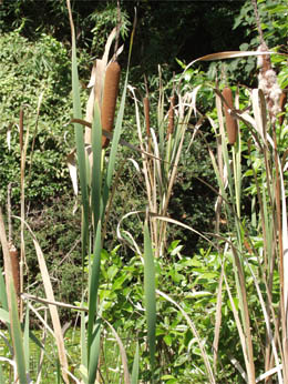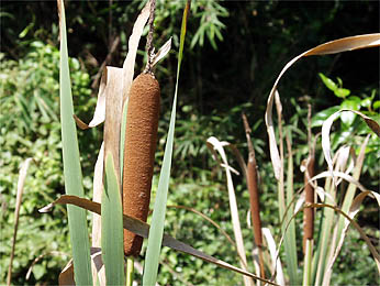 「いなばの白ウサギ」で有名なガマです.ガマには,コガマやヒメガマというよくにた別の種類がありますが,この池の東岸部に生えているのはガマです.池の北側の広い範囲に生えているのはヒメガマです.区別のしかたは「ビオトープ水生植物図鑑」にくわしく説明していますので見てください.