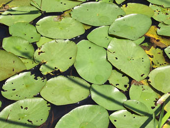 この池の水面に葉を広げる植物(浮葉植物といいます)のなかで,いちばんたくさん見られるものです.新芽には寒天状のものがついていて,みそ汁やおすましに入れる具として重宝されています.