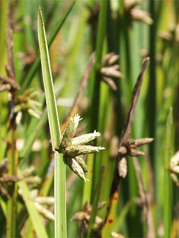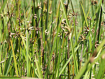 茎の断面が三角形をしている,水面から突き出る生え方をする(これを抽水植物といいます)植物です.よくにた植物にサンカクイというのがあります.