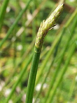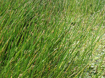 池の西の方に生えている細長い植物です.水面からつき出るようにして集団で生えています.茎の中は空どうになっています.