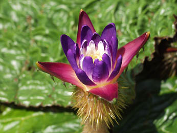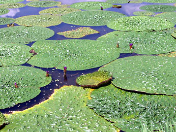 直径1メートル以上にもなる大きな葉を水面に浮かべています.葉の表側にはトゲがたくさんついています.夏のさかりにむらさき色の美しい花を咲かせますが,これには実がつかないことが多いようです.