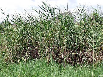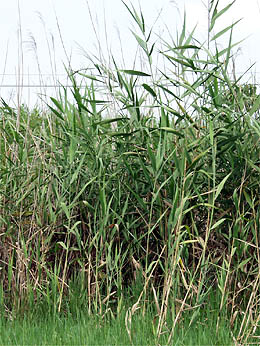 アシということもあります.とても背が高くなる植物で,池によってはとてもたくさん生えていることがあります.この池ではまわりの浅いところにそって,一周全部に見られます.