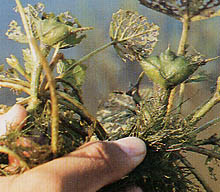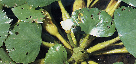 ヒシ科の一年草で当地方全域に分布し、最も普通に見ることができる。葉がひし形で名もそのことによる。茎は長く泥中の根から水面までのび、節があり、各節から羽状の水中根が生ずる。花は7〜10月に、径1cmほどで4弁の白色のものをロゼット状に束生した葉の中心部に出して咲くが、小さいために目だたない。