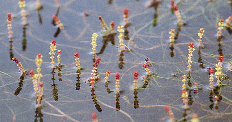 ホザキノフサモは1年を通じて生育するため、冬に水を抜くため池には生育できない。神戸周辺では加古川水系の河川に見られる。