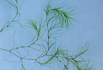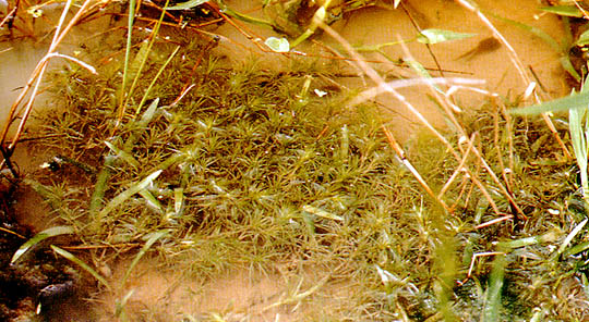 茎は細くよく分枝し、長さ約30cm、50cmほどになるものもある。下部の節より根を出し群生する。葉は長さ約2cm、幅は約0.5mmで縁に微小なきょ歯がある。トリゲモや他の近縁種にくらべて、葉の基部にある葉鞘の先が披針形(細い三角形状)につき出ることによって区別できる。採集し、葉の先を持って引っぱると、葉のつけ根に耳状に葉鞘がつき出ればすぐに判明する。トリゲモ、オオトリゲモに比べて手ざわりがやわらかく、葉の外側へのそり返りも少ない。