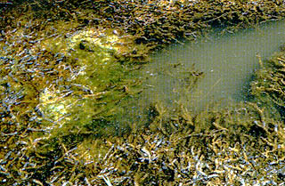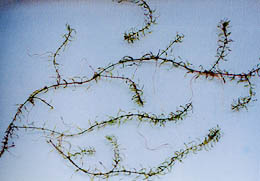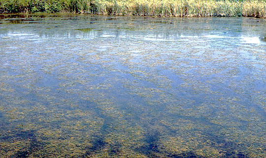 トチカガミ科コカナダモ属の多年草。茎はやや硬く、長さ20〜50cm、茎の節から水中根をまばらに出す。葉は2〜4枚、ふつう3枚を輪生する。左右へねじれている。茎葉は折れやすいが、再生力が強く、切れた茎の節から根を伸ばし増殖する。1963年に琵琶湖で確認されて以後、関東以西の各地で繁殖して、琵琶湖などでよく問題にされたが、昨年5月には尾瀬沼に異常繁殖しているという記事が新開に掲さいされた。この地方の各地に生育しているが、生育地ではどこもかなり密生し、大きな群落を作って、クロモに入れかわっているようである。日本には雄株だけが帰化している。