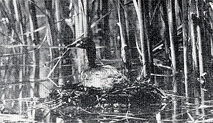 正常な高さの巣でも、産座は水面からいくらもないので、卵のまわりの巣材の水草は、しみ出した水でつねに湿った状態にある。そのため、はじめは純白の卵も、水あかに染まって数日のうちに汚れが目立ちはじめ、褐色になる。