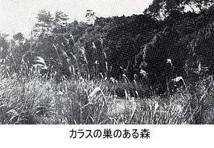1975年(昭50年)5月、東須磨にある勝福寺の裏山での出来事である。須磨女子高等学校の西側の谷にあるトビの巣を調べながら谷を下りさって、人家の近くまできたとき、80mほど先にある高圧電柱で休んでいる2羽のハシボソカラスを見つけた。2羽の挙動から、いずれかの繁殖過程にあるのが、ひと目みてわかった。