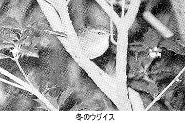 町の庭に来るウグイスは早春に限ったものでなく、むしろ数の上では11月頃が多い。オリーブ褐色の地味な色とやぶの中をくぐる習性によって、その姿はさえずりほど人には知られないですんでしまう。また、地鳴きはあの美しいさえずりから想像もつかない地味な声であり、これがウグイスであると知る人も少ない。このような所に出てくるウグイスの場合、冬はほとんどさえずらないものである。冬によくさえずりをきく場所はウグイスにとってはそれなりに環境に恵まれた余裕のある場所のようである。