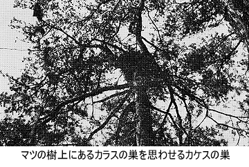 それでは、カケスはどれくらいの高さに巣をつくるのだろうか。六甲で多数の巣を調べたところ、最も低いものは小さいアセビの80cmの高さにあった。巣のそばに立てば、ヒザの少し上あたりになる。多いのが、3〜5m、高い巣では10mもあるマツの枝に作ったカラスの巣かと思うようなものがあった。このようにカケスの巣の高さはまちまちであるが、彼らが選んだ高さは、地上からというより、森の中層を作っている樹木の樹冠近くを選んでいるといえる。