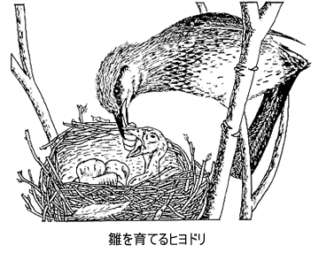 人里近い所のヒヨドリは巣材におもしろい適応性が見られる。針金ばかりでできたカラスの巣の話を聞いたことがあるが、ヒヨドリの巣によく使われるのはナイロン、ビニールなどのヒモ類や布の切れはしなどである。なかには赤いひもを多量に使った派手な巣もあった。適応範囲の広さを調べてみるのも興味のある問題である。