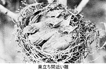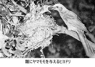 巣雛の餌は動物質が多いが果実もよく与える。ちがった場所で調べた2例の親鳥が巣に持って来る餌は、それぞれの環境がかなり違うのによく似ていた。どちらの例でも昆虫が多かったが、柔かく消化のよさそうな虫は意外に少なく、かたい昆虫が多い。スズメバチ、アシナガバチ、カメムシ、コガネムシ、少数のガ、小さなバッタなどが主であり、チョウやガの幼虫のような消化のよさそうなみずみずしいものは少なかった。ウグイスやシジュウガラと少し違った傾向である。その好みは季節がちがっても共通の点が多かった。果実ではヤマモモが圧倒的に多い。ある2例の巣は、別の年の同じ頃に発見した巣であるが、その片方はすぐ近くに大きなヤマモモの木があって、そこへたびたび通った。もう一方の巣では200m以上離れた所までヤマモモの木がなく、それをとりに出かけているのがみられた。孵化後間もない雛の口に、その頭ほどあるヤマモモを丸ごと押し込んでいる光景はへビが卵を飲むのとそっくりで鳥が爬虫類から進化し、その特徴を多分に残しているといわれている証拠をみせつけられるようであった。植物質と動物質とは平均的に見ておよそ1対3で、日によって植物質の餌の多いこともあり、近くに適当な果実のない季節では昆虫の比率が高かった。町の庭先の巣で、スズメ用にまいた食パンの切れはしを多用する親を見たが、このような食物で雛の健全な成育ができるかどうか心配であった。その雛は標準的な日数で巣立ちはしたが、気のせいかひとまわり小さく感じた。野鳥に給餌する際の弊害はこのへんにも表われるのではないかと思われ、十分に注意しなければならない。雄親雌親ともに育雛に従事するが、雄親の持って帰った餌を雌親がねだってとり、それを雛に与える二重手間をすることが多い。