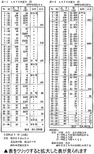 さて、どのぐらいの数が渡るものなのか、二つの観察例を表にあげた。(表1・表2参照) 30分ごとに区切った観察時間を記入したので、渡りの中心の時間帯もみていただきたい。雨の日は渡らないが、少々の風があっても、曇っても平気で渡る。しかし、何といっても、どこまでも青い秋空の中を渡るのがもっとも渡りにふさわしい光景である.またこういう日が特に数が多いものである。