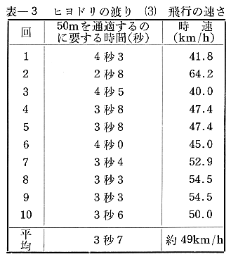 飛翔の速さにも興味があったのでいくつかの例を出してみた。50m隔たる2点にそれぞれ1人ずつ立ち、その真上を通過して行く群の先頭の個体がその2点間を通過するのに要する時間をストップウォッチで計測するというきわめて原始的な方法である (表3参照)。2点の距離も、200mはとりたかったのだが、見通せる2点に適当な場所がなかった。しかし、およその見当はついた。計測値にむらがあるように見えるが、実際に見ていても、速く飛ぶ群と遅い群があることがわかる。これは本気で渡っている群と、そうでもないといった群があるためではなかろうか。大きな群で、早朝に高く飛ぶ群は真剣にみえ、その逆の小さな群で低く飛ぶものは、どこか道草でもくってやろうかと考えている遊び半分のふうでもあり、渡る方向に自信がなさそうにもみえる。