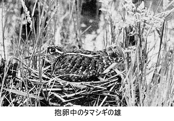 繁殖期に入る晩春の夕方、雌はよく通る声で鳴きはじめる。低い声で 「ウーォッ、ウーォッ」と数声鳴き、続いて大きな声で 「コーッ、コーッ」とやる。5〜6声で終ることが多いが、最盛期になると30〜40声続けて鳴くことも多い。同じ水田地域に鳴くバンやヒクイナ、カエルの声と重なってもひときわはっきりと響きわたる音色である。盛んに鳴く頃はこの声によって所在がわかり、大まかな数もつかみやすい。雄雌の棲息比がわからないので鳴かない雄は数にあがってこないから片手落ちかも知れないが、一般に多くの鳥では雄雌の棲息比はそんなにかけはなれたものでない。しかし、タマシギではその習性から見て繁殖期の一定区域内の棲息数は雄の方がいくらか多いのではないかと推定できる。これは、この鳥の繁殖習性の雄雌の仕事の分担が、ふつうの鳥類と大幅に転倒し、その上一妻多夫の珍らしい鳥だからである。これから紹介する話は、この風変りを繁殖習性を中心としたものである。