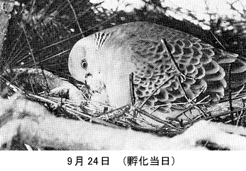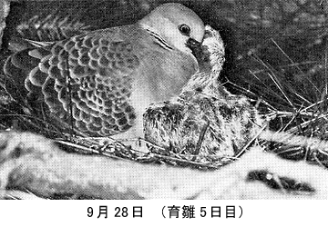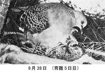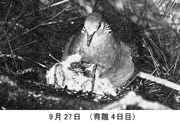 観察をはじめた9時頃、雄が抱卵していたが、いつもと違って落着きがない。胸の下を気にして盛んにもぞもぞと動く。間もなく1羽の雛が、親の胸の下から黄色のうぶ毛を見せているのに気がついた。卵の殻は木の下に落ちており、朝早くに孵化したものらしい。14時頃まで何度も餌をやっているのが見られた。そのようすは次のようである。雛の動きが盛んになると親鳥は体を少しずらし、胸の下から顔を出す雛の嘴を軽くくわえるようなしぐさをする。雛はこれに答えて、頭をふり上げながら嘴で何かをさぐるようなしぐさをする。親は雛の嘴を自分の口の中へ導いてやる。雛は親の喉深く嘴をさし入れて液状になった餌をもらう。親は頭を上げたり下げたりしながら、そのうの中の餌をしぼり出しているようで、苦しそうな表情に見える。