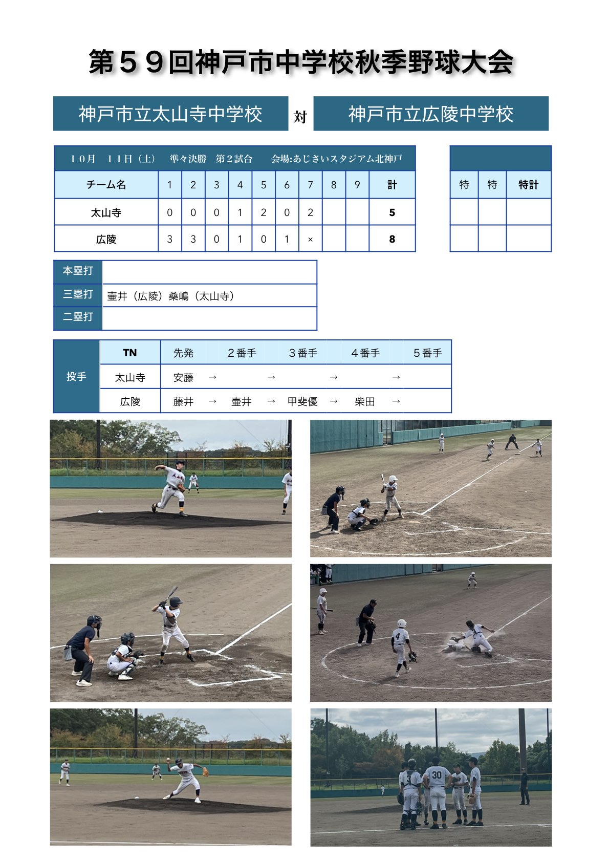 第59回神戸市中学校秋季野球大会の準々決勝4試合が