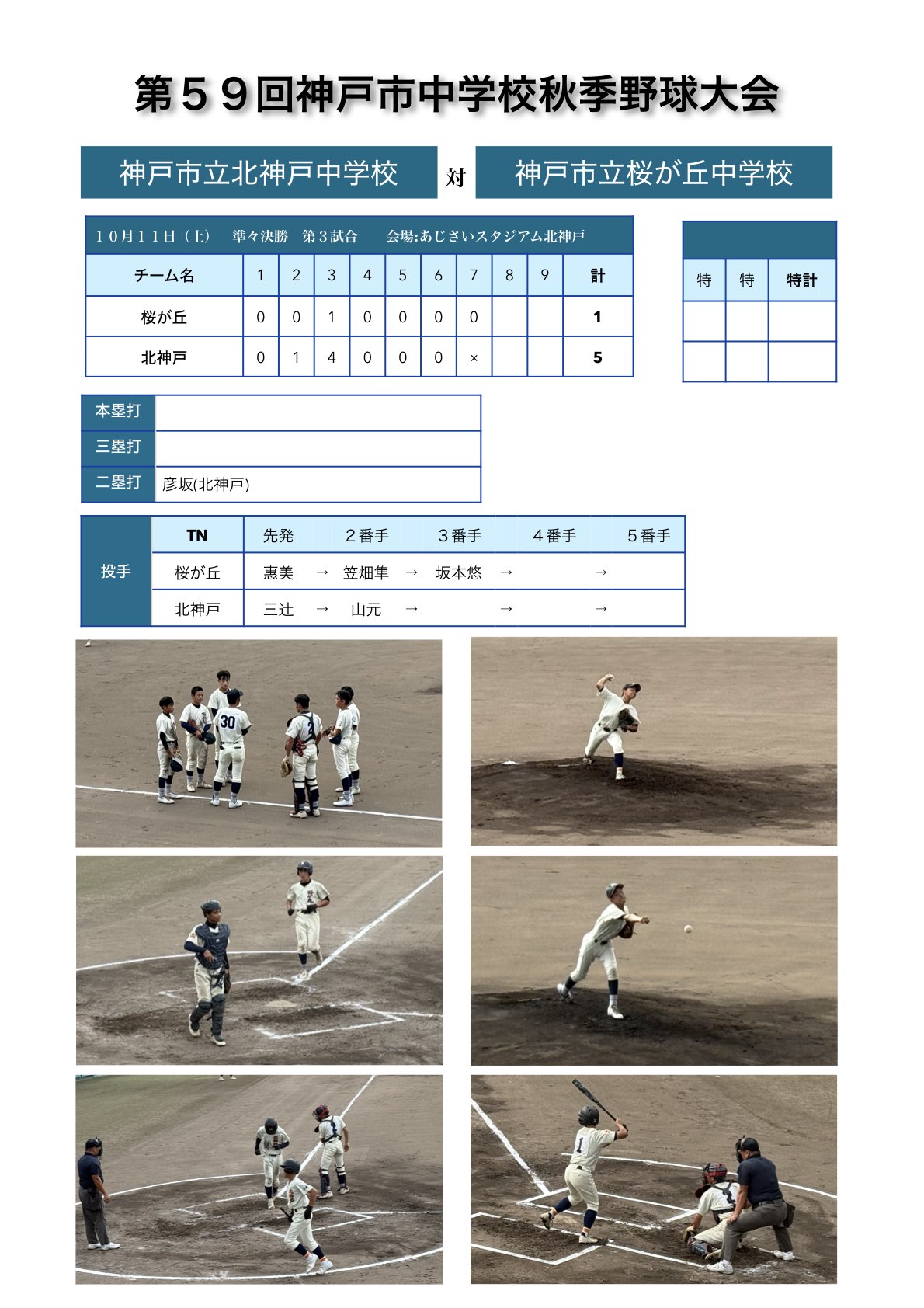 第59回神戸市中学校秋季野球大会の準々決勝4試合が