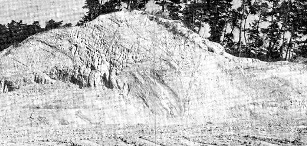 断層の北側の地層は徐々に傾斜をまし、断層面ではほとんど垂直に近い傾きである。そして、これらの粘土層、砂層などは、断層面の南側には見あたらない。地層がクシャクシャに乱れた、幅1メートルぐらいの部分をはさんで、南側は砂や小石のまじった層と粘土層とである。この地層の傾斜は非常にゆるい。
