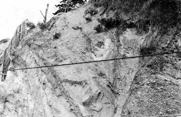 ここの断層面は地層が食いちがっていて,初心者の学習には絶好の場所であったが,最近はコンクリートでうすくおおわれてしまった.