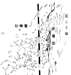 そこでは、山側の花こう岩が、垂直にそぎ落とされた面を見せ、そのあちこちに断層粘土が生々しい色でへばりついていた。そして浜側には生田川が運んできた砂利や砂の層が、わずかに川下に傾いていた。この両者の境はじつに歴然としており、工事関係者の知らせでかけつけた者たちは、一瞬固唾をのんで、断層面に見入った。