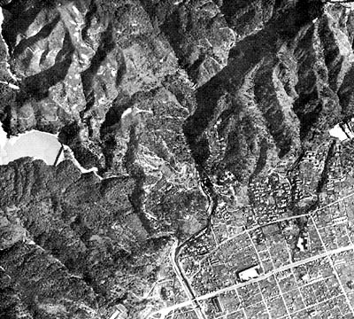 布引付近(新神戸駅より東へ)の谷すじを見ると,どれも諏訪山断層より北側は右に引きずられるように曲がっている.これは散訪山断層を境にずれ動いたためである.このような水平断層を右ずれ断層という.この航空写真は昭和24年(1949年)にアメリカ軍が撮影した2万分の1の写真.