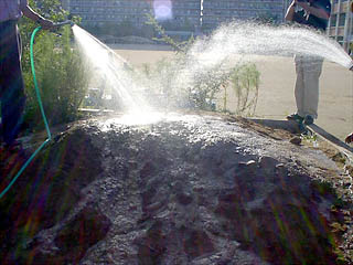 - 山の頂上付近から、ホースで水を流す(上右の写真)。
