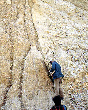 私たちはさっそく断面にクリノメーターをあててこの断層がどの方向に続いていくのかを調べてみました。クリノメーターを水平にしてその側面を断層面にそわせます。N35度E、それが断層の続く方向です。北の方向から東に35度ふった方向という意味です。もちろんこれは、南から35度西にふった方向というのと同しです。この両方向に追いかけていけば、この断層の延長部が見つかるはずです。断層の前後の地層のスケッチをした後、私たちは車を走らせて地図の上にのばしてみた断層の延長があらわれそうな所まで行ってみました。その時にはまだ工事が進行しておらず断層はあらわれていませんでした。しかし、その後工事が進むにつれて予想どおり数か所で同じような断層面があらわれました。