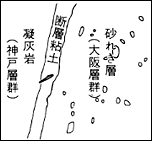 私たちはある日この断層の続きぐあいがどうなっているかを調べるために、高塚山の周辺を歩きました。とは言ってもそこは草木のおいしげる山の中で断層面のあらわれる露頭は期待できません。こんな場合、断層がどこを走っているかはどのように判断するのでしょうか。もし断層がそこにあれば地表に出ている地層は、断層の西側で神戸層群、東側で大阪層群が分布していることは分っています。山道を歩きながら、地層が急に変わる地点をさがすわけです。実際に調べてみると、ある所まで神戸層群が分布し、10mほど間をおいて大阪層群というところがみつかりました。断層を横切るようにして断層の右へ左へと往復するようにして歩くと、このように断層そのものの露頭が見つからない山の中でも断層を追跡することができます。この調査の結果この高塚山断層は高塚山の北西300mの地点で方向をかえ、北西−南東方向にのびていくことがわかりました。