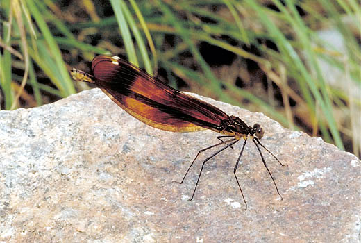 生態:中央区葺合町での観察によれば,5月の中下旬に羽化して,多数が河原を飛んでいるのがみられます.真夏には生殖活動がさかんで,産卵する メスのまわりをオスがせわしなく飛んでいるすがたが観察できます.ふだんはオス,メスとも石の上などに翅をたたんで止まっています.秋早くにはすがたを消してしまうようです.単独植物組織内産卵を,時に潜水しておこないます.